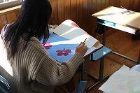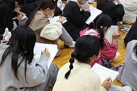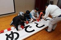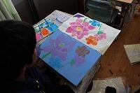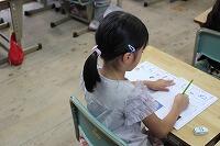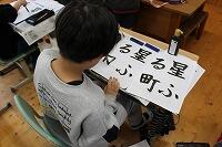 いつもは自分が持ってきた半紙に文字を書くだけですが、今日は半紙に自分だけの模様を付けてから、その半紙に文字を書きました。模様を付けた紙に書くことで、いつもよりもきれいに書こうという気持ちも高まったようでした。淡く優しい色が付いた紙に、ふるさとの文字が美しく浮かび上がり、素敵な作品ができあがりました。