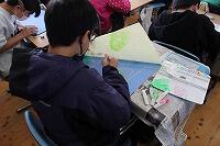 出来上がったものは、班の友だちと交換しながら伝え合ったり、班以外の友だちが何を見つけたのか、模造紙に貼ったものを興味深そうに見たりしていました。