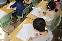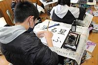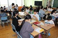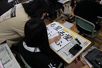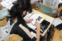 5年生は書写の時間に、穂先の動きと点画のつながりを意識して「ふるさと」を書くことに取り組んでいました。