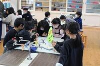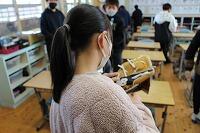 教室で手回し扇風機の使い方や実験内容の説明を聞いた後