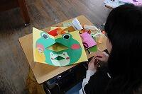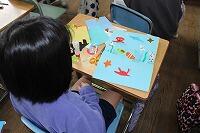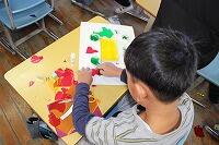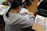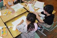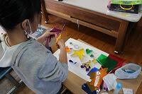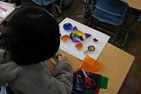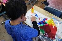 6日(火)に、3年生は図画工作で、カラーセロハンなどの光を通す材料を使って、作品づくりをしていました。子どもたちは、台紙に動物や星など様々な形を作って貼り付け、その中にカラーセロハンを貼ったり、詰め込んだりしていました。