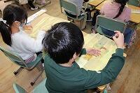 21日(木)に、3年生は国語の時間に物語を作っていました。子どもたちは、宝物を探しに行くという1枚の絵地図を見て、登場人物や出来事など話の展開を自分で考え、段落など表現方法を工夫しながら作成していました。ワークシートに書き終えた子どもは、タブレット端末で入力し、クラスルームに投稿していました。子どもたちは、自分が作った物語を友達に読んで伝えたり、友達の作った物語をタブレット端末を使って読み合ったりして楽しんでいました。