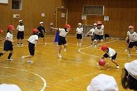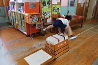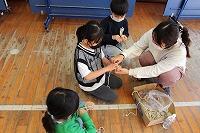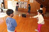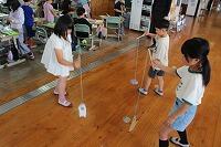 また、多目的ホールでは、お手玉やけん玉、こま回しを体験しましたが、お手玉やけん玉は、少しづつできるようになり、満足げな様子でした。こま回しは、こまに紐を巻きつけることが難しく、なかなか回すことまではできませんでしたが、子どもたちにとっては貴重な経験になったことと思います。