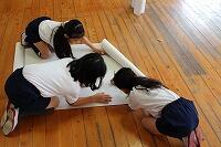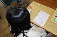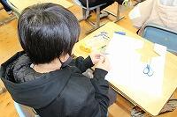 また、5年生は算数の授業で、黒板に示された立体の展開図を工作用紙に描いて、その図をはさみで切り取り、立体を作っていました。まず、三角柱の展開図を子どもたちはコンパスや定規を使いながら工作用紙に描いて、上手に立体を完成させていました。次の六角柱の展開図は、少し難しかったようで、頭の中でイメージしながら一生懸命考えていました。