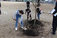 7日(水)に、6年生が学校創立150周年記念事業の一つとして「記念植樹」を行いました。記念樹は、創立150周年記念事業実行委員会が地元の造園家さんに相談して、何種類かの樹木の中から「ハクモクレン」「モクレン」が選ばれました。記念植樹では、実行委員長の赤塚PTA副会長さんから記念植樹についての話や教頭先生からモクレンについての紹介がありました。その後、6年生の子どもたちが、造園家さんに事前に植えていただいたモクレンの根元に土をかけていきました。