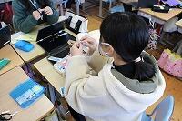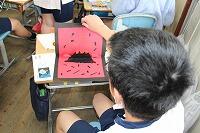 また、1年生は図工の時間に版画の仕上げをしていました。刷る作業では、子どもたちは手を真っ黒にしながらも一生懸命取り組んでいました。出来上がった版画は、切り取って台紙に貼り、立派な「にらめっこ」になっていました。