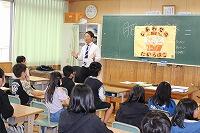 授業では、お金が物々交換の中で使われるようになり、現在は紙幣からキャッシュレス化に変化するなど「お金の歴史」についての話があり、子どもたちは興味深そうに聞いていました。また、将来、給料として働いて得られるお金は、誰かの役に立ってもらうものであるいうお金の価値であったり、将来、自分たちが納める税金や社会保険がどのように自分たちの生活に活用されているのか、そして、将来、生活する上で必要となる費用にはどんなものがあるかなど具体例をもとに分かりやすく話をしてもらいました。子どもたちは、逆瀬川様の話を真剣な表情で聞き、しっかりとメモをしたり、質問したりしていました。