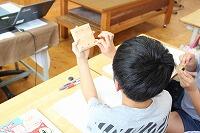 30日(木)に、2年生は図工の時間に「紙けん玉」を作っていました。子どもたちは、玉の部分となる厚紙をいろいろな形に切り抜いた後、思い思いに色を塗っていました。
