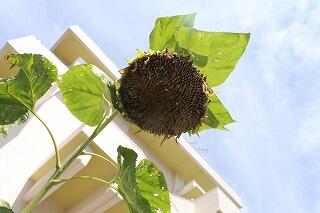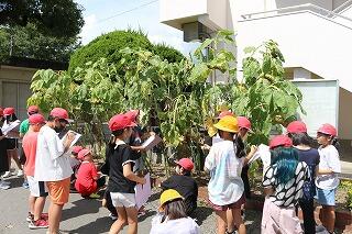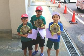 3年生がひまわりの観察をしていました。7月には、まだ身長ぐらいの大きさで、花も咲いていなかったひまわりが、身長の2倍ほどに成長し、咲き終わってたくさんの種ができていました。花の部分は1キログラムほどあったそうです。子どもたちもその大きさにびっくりしていました。