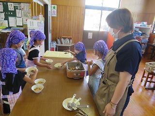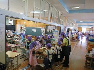 2学期から1年生は給食を自分たちだけで準備します。6年生がいなくても、自分の役割をしっかり考えて、てきぱきと協力して準備できていました。