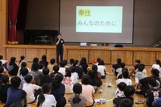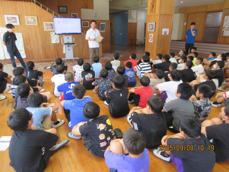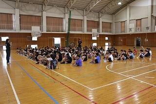 また、生徒指導主事の先生の話のあと、都城警察署の方をお招きして、子どもたちにきまりをまもることの大切さについて、お話ししていただきました。