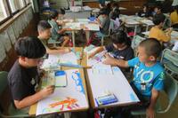 先生の言葉かけに、子どもたちは発想を広げ、思い思いに絵を描いていました。先生が、絵の具の使い方のコツを説明しながら実演すると、こどもたちから、「すご~い!」「きれい!」の声があちこちから聞こえました。その後、早速、色塗りの技を試していた子どもたちでした。