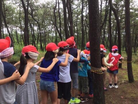 全員目隠しをして、前の友達の肩を持って進んで行くセクションです。
