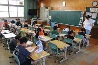 都城市では、「子どもたちが主役の授業」を目指しており、本校でも授業改善に取り組んでいます。今日の授業でも子どもたちが黒板を使って考えを発表して、それを聞いた子どもたちが質問したり、意見を出したりしながら考えを練り上げていました。その間、先生は教室の後方に立って、子どもたちの意見やつぶやきをひろって、子どもたちに問いかけて、グループで積極的に意見交換する姿が見られました。