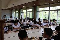 御池青少年自然の家に到着すると、入所式やオリエンテーションが行われ、自然の家の方々から温かく迎えていただきました。その後、子どもたちは、レストランで昼食でした。みんなで声をそろえて元気よく「いただきます。」の後、楽しそうに食事をしていました。