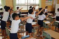 また、4年生は体育館で運動会に向けてダンスの練習に取り組んでいました。子どもたちは、ステージ上のモニターや模範演技をする児童を見ながら音楽に合わせて、元気よく一生懸命に取り組んでいました。