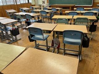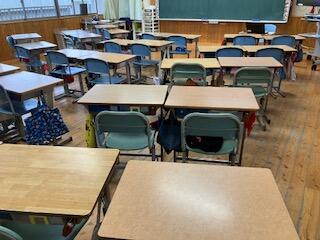 5・6年生の教室付近を歩いていると、誰もいない教室がありました。専科指導のため、他の教室で授業を受けているようです。その誰もいない教室を見てみると・・・
