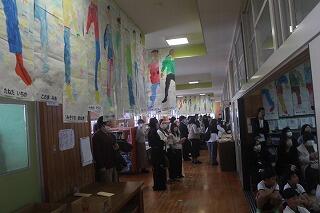 2年生の廊下(オープンスペース)には、児童一人ひとりの等身大の絵が掲示されているなど、成長が一目でわかる工夫がありました。