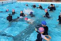 子どもたちは、水中ジャンケンなどウォーミングアップをした後、クラス対抗の「宝探しゲーム」や「水上版ポートボール」を楽しそうに取り組んでいました。特に水上版ポートボールでは、最初はボールに群がってた子どもたちは、自陣のゴール前でパスを待ったり、相手のゴール前で阻止しようとしたりと、それぞれが役割分担しながらクラスの勝利を目指して頑張っていました。ブロックやゴールが決まると、両手をあげて大喜びでした。