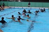 その後、1年生は、肩から頭まで順に水の中に入ったり、水をかけ合ったりして水に慣れてから、水の中を歩いたり、走ったりして、最後はみんなで流れるプールをつくりました。5年生も、水に身体を慣らした後、プールの左右の端から端まで泳ぐ練習をして、最後はどこまで泳げるか挑戦していました。どちらの学年も子どもたちは、命に関わる学習でもあることを理解し、先生の指示をしっかり聞きながら、楽しんでいました。