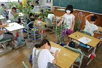 10日(水)に、2年生は生活科の時間に自分たちで育てている野菜の観察して記録していました。中には、自分の身長よりも大きく育ったミニトマトもありました。子どもたちは、ピーマンや茄子、ミニトマトなど自分で選んだ野菜に顔を近づけながらじっくりと観察して、色や大きさ、形など成長した様子を自分の言葉で記入していました。
