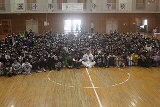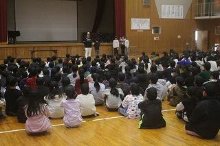 贈呈式には4年生以上の児童約370名が参加。途中、森選手へのサプライズとして、森選手が6年生時の担任の先生との面会の場面も企画するなど、森選手を応援したいという思いが溢れる贈呈式でした。
