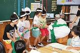 みんながナレーター役として教科書を読み、おじいさん、おばあさん、孫、犬、猫、ねずみ役の子どもたちが、それぞれの役になりきり、力を合わせて「かぶ」を引っ張っていました。引っ張る人数が増えるにつれて「うんとこしょ、どっこいしょ。」のかけ声もどんどん大きくなり、かぶが抜けると、みんなで喜んでいました。