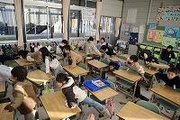 「緊急地震速報です。」の放送が流れると、子どもたちは素早く机の下に身を隠し