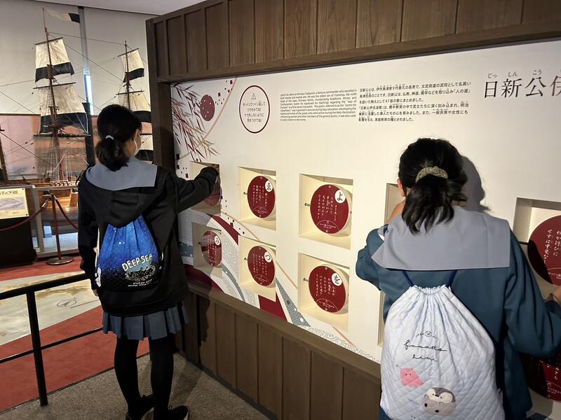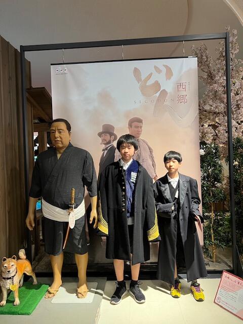 維新ふるさと館で歴史について学びました。シアターでは、幕末の薩摩について学んだり、いろいろな展示物を見たり、楽しみながら見学しました。西郷隆盛や大久保利通の衣装を着て写真を撮るコーナーも人気でした。