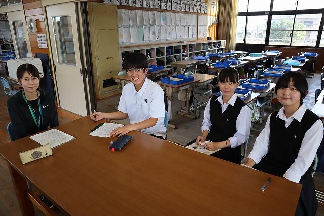 3人は、まず、西高OBの5年担当の下薗先生の授業を参観した後、校長室で長谷川校長と西高OGの下野教頭を交えて、教員の仕事等について取材を行いました。