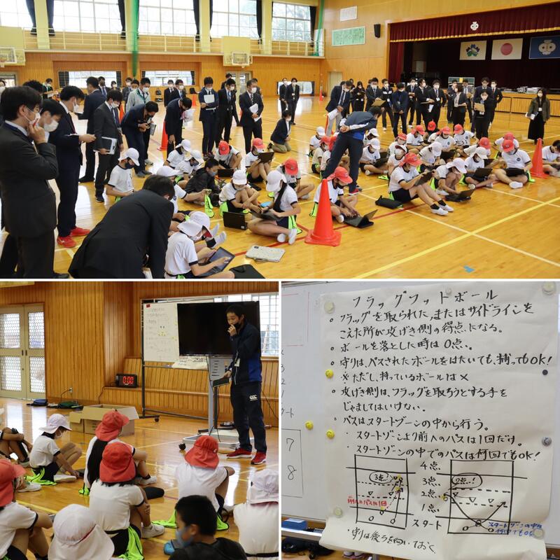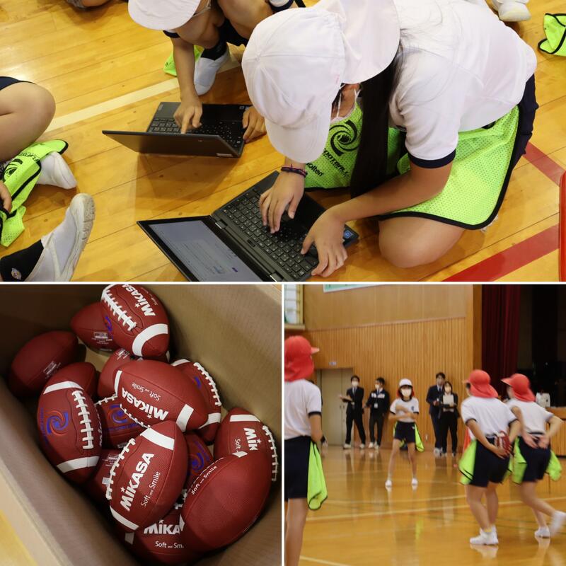 6年4組のこどもたちと、井手先生が『フラッグフットボール』を行っています。