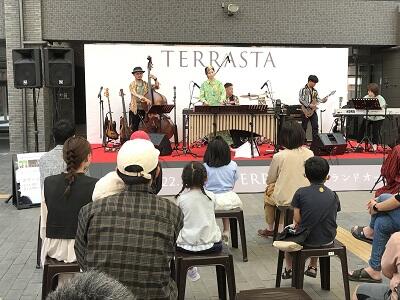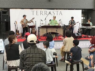5月4日(水)街中に開業した「テラスタ」のオープニングイベントに、本校の 鈴木 弘一 教頭が、バンド「ベル・ウッド」のベース(写真左)コントラバス(写真右)の奏者として出演しました。演奏はもちろんですが、軽快なトークで観客を楽しませてくれました。特に、マリンバ奏者(中央)の奥様との息の合った演奏とトークが、観客との一体感を演出していました。