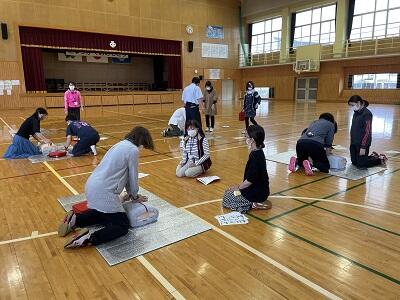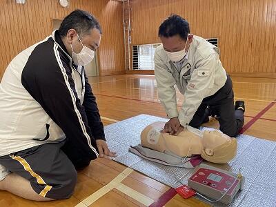 全職員で胸骨圧迫、心肺蘇生、AEDの使用方法について学びました。