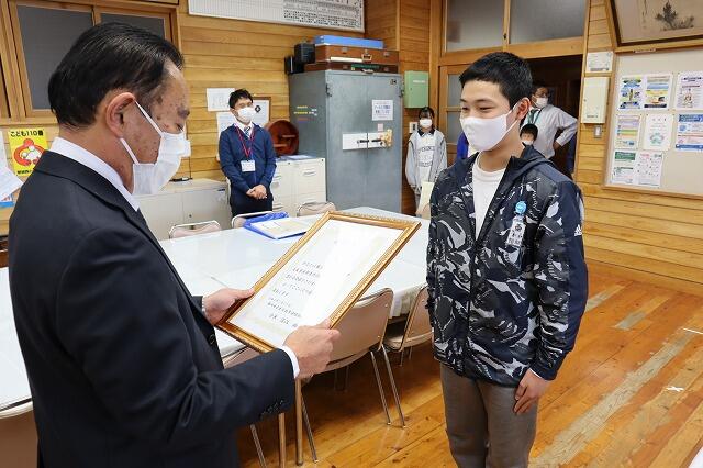 その翌日に行われた、校長室での表彰式の様子です。