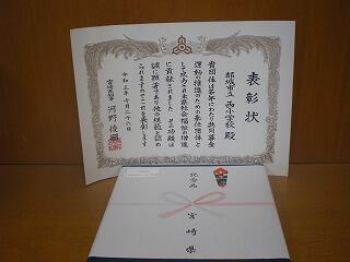 10月26日、宮崎観光ホテルにおいて、本校が、県社会福祉協議会から共同募金運動への貢献が認められ、県知事表彰を受賞しました。共同募金は、身近な社会貢献の一つですが、永年の取組が受賞につながりました。学校の取組ですが、保護者の皆様の理解があったからこそだと思います。また、これまでの卒業生や地域の方々の活動が続いた結果なので、西小の子ども、保護者の皆様、卒業生、地域の方々のおかげだと感謝しています。