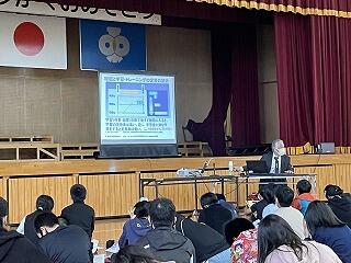 11月18日(木)に、第2回学校保健委員会を開催しました。講師に高千穂町教育委員会教育長 戸敷 二郎 先生を迎え、「睡眠と学習と脳」をテーマに講演していただきました。1情報の整理とスキルアップは睡眠中に行われている 2しっかりと眠る子どもは学力が高い についてデータや動画を基に具体的に分かりやすくお話をしていただきました。感想を紹介します。「睡眠は、学習やスポーツの成果に大きく影響することが分かりました。寝ている間にスキルアップしていることを知ったので、寝る時間を増やそうと思いました。学習を睡眠までセットで捉えることが大切だと思いました。セロトニンというホルモンは、子どもの時しか発達しないホルモンなので、リズムのある生活や日光の下で活動して増やしたいです。夜間に浴びるブルーライトは、学習効果の低下に影響があるので気を付けたいです。」(6年児童) 今、この時期に親子で健康について考えるよい機会となりました。