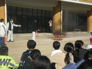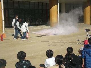 1月14日(金)5校時に避難訓練を実施しました。家庭科室から出火の想定で、全児童が運動場に避難しました。避難修了後に、シマダ防災設備さんから、都城圏域の火災の発生状況や原因についてお話を聞きました。続いて、消火器を使って6年生の児童代表が消火体験を行いました。火事を見たり火事に気付いたら「逃げる」「通報する」「消火する」役割があることについて、真剣に話を聞いていました。一番の役割は、火遊びによる火災を起こさないことです。