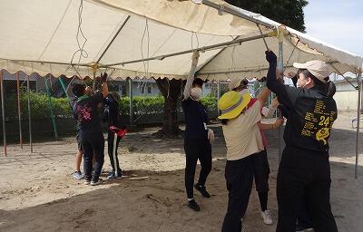 子どもたちに日陰を作るために、額に汗してがんばります!