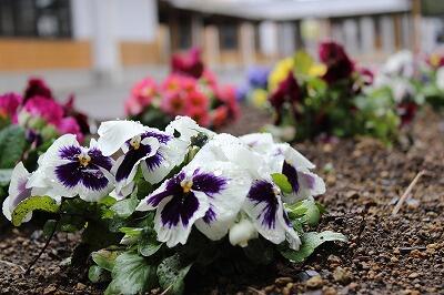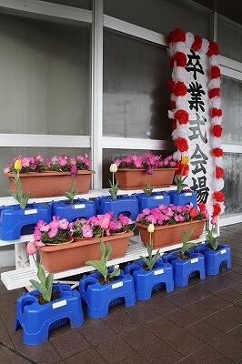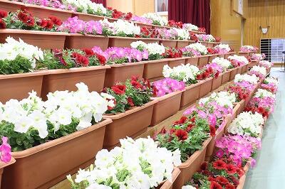 担当職員と委員会の子どもたち、4年生も手伝って美しく咲きました。