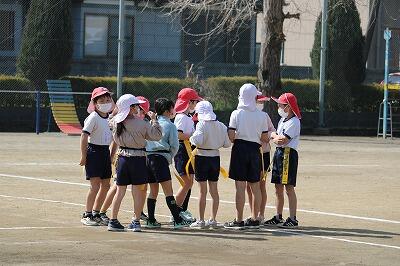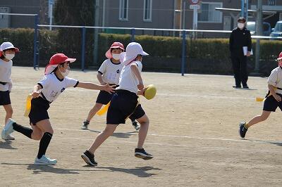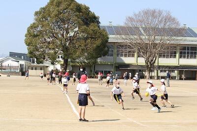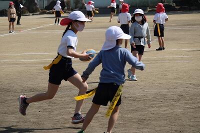 運動場で3年生の子どもたちがタグラグビーをしていました。