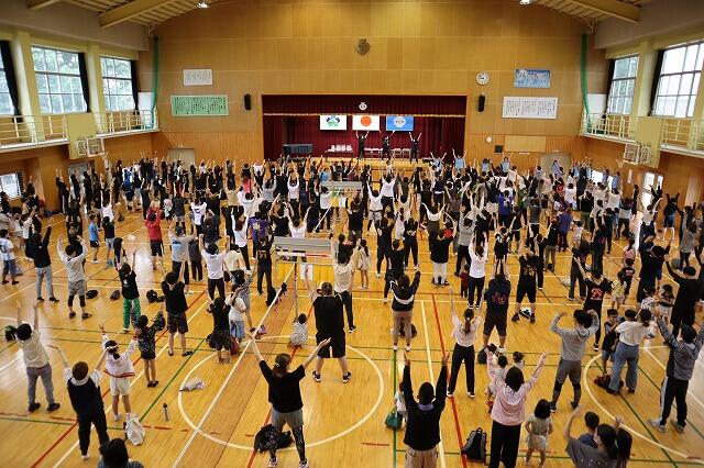 今年度採用された3人の先生たちがステージに立ちラジオ体操で準備運動をしました。