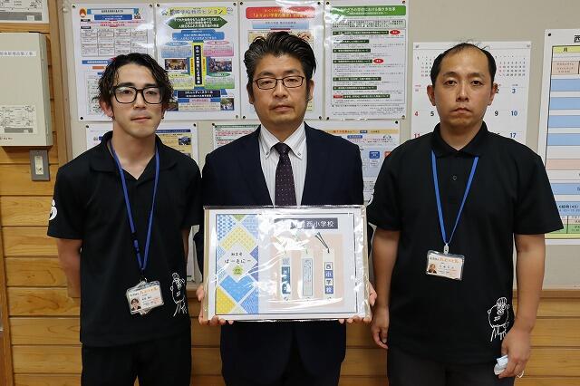 施設長の三原さん、支援課長の外勢さん、支援員の松栄さんが西小学校へ届けてくださいました。ちなみに外勢さんは、本校の保護者でもあります。