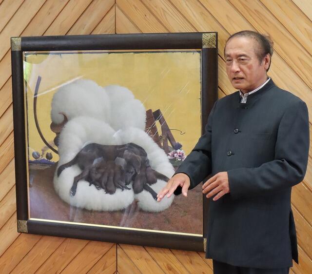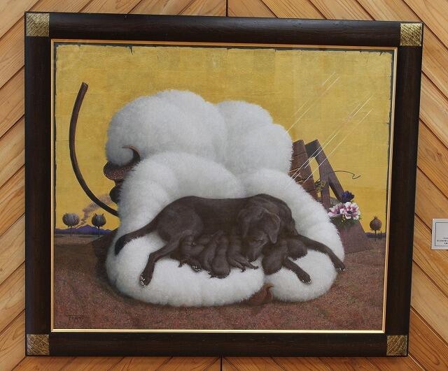 この絵画は、「誕 生(たんじょう)」というタイトルで、縦120cm、横135cmの大きな作品です。作品のテーマは、母犬の愛情通じた「平和」への思いだそうです。画面の左奥には、ふるさとの霧島連山も描かれています。