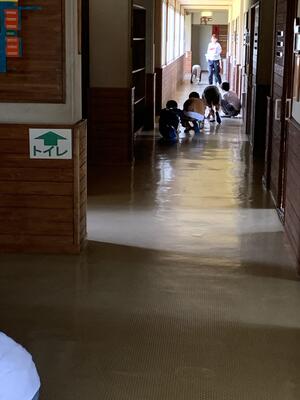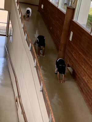 長い廊下をぞうきんで一生懸命ふく姿が見られました。