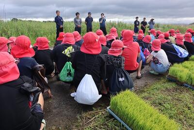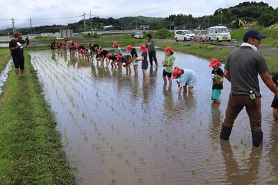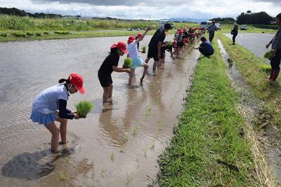今日は、JA青年部の方々のご協力をいただきながら、5年生全員でもち米の苗を手植えしました。