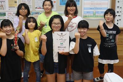 都城西少女バレーボールクラブ(メンバー:北原 菜々美さん、荒川 陽葵さん、池田 愛梨さん、谷脇 小雪さん(以上6年)、米永 純怜さん(5年)、立山 愛実さん(4年)、池田 乃愛さん、日高 寿珠さん(以上3年)、谷脇 一楓さん(2年)、日高 瑠凜さん(1年))が、6月23日に行われた、第60回宮崎県スポーツ少年団都城市・北諸県郡ブロック大会で、第3位に入賞し、7月に行われる宮崎県スポーツ少年団中央大会に出場するとのことで、報告に来てくれました。