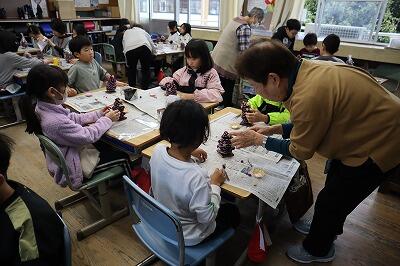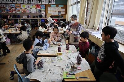 地域の方をお招きして、3年生が松ぼっくりツリーづくりを行いました。