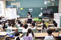 「ごきげんいかが」の学習で、ジェスチャーを交えながら「幸せ」「元気」「お腹がすいてる」「眠い」などの英語での表現を教えていました。子どもたちは友達とカードのやりとりをしながら覚えたての英語で自分の気分や状態を伝え合う活動を頑張っていました。