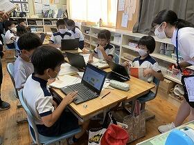 1年生、2年生は、運動会で発表するダンスの最終練習をしました。児童は、衣装を着けて飾りを持ち大きな動作で元気いっぱいに踊っていました。運動会が楽しみです。4年生は、国語の学習でグーグルフォーエデュケーションのジャムボードというアプリを使って、説明文の構成について班ごとに話し合い、全体で確認をする活動をしました。授業でのICT活用が進んでいます。