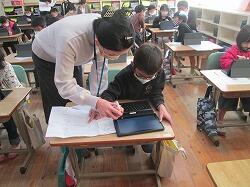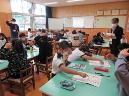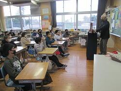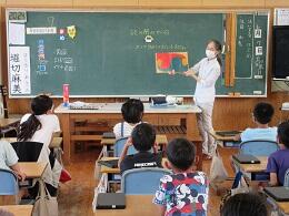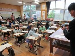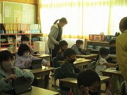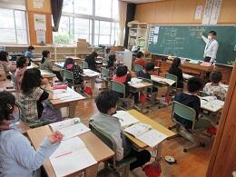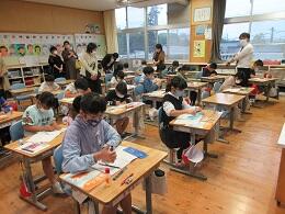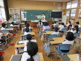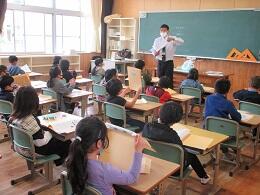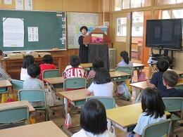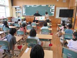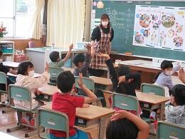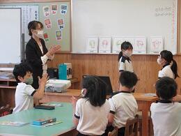本校には、教育委員会からALT(英語指導助手、写真では眼鏡の女性)が週2回派遣され、3年・4年の外国語活動、5年・6年の外国語科の授業に入っています。学級担任の授業を補助し、英語の発音や英会話の仕方について子どもたちに専門的な指導を行っています。とても親切で丁寧な指導で、子どもたちが英語に興味や親しみを感じながら学習することができています。